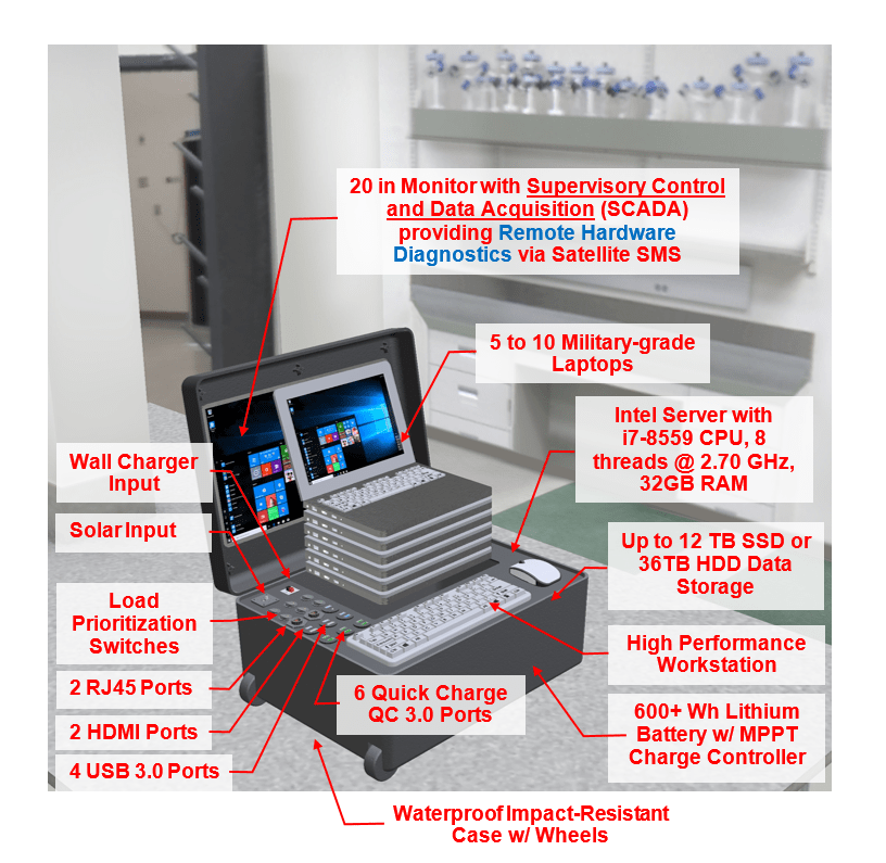 The EmpowerClinic reliable solar power, computing, internet connectivity, remote hardware monitoring, and intelligent equipment diagnostics.