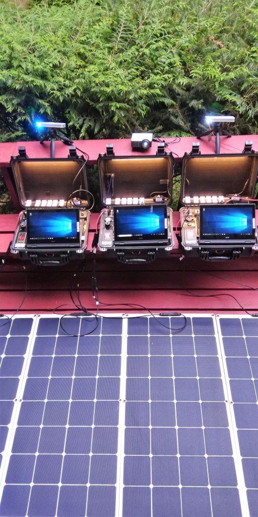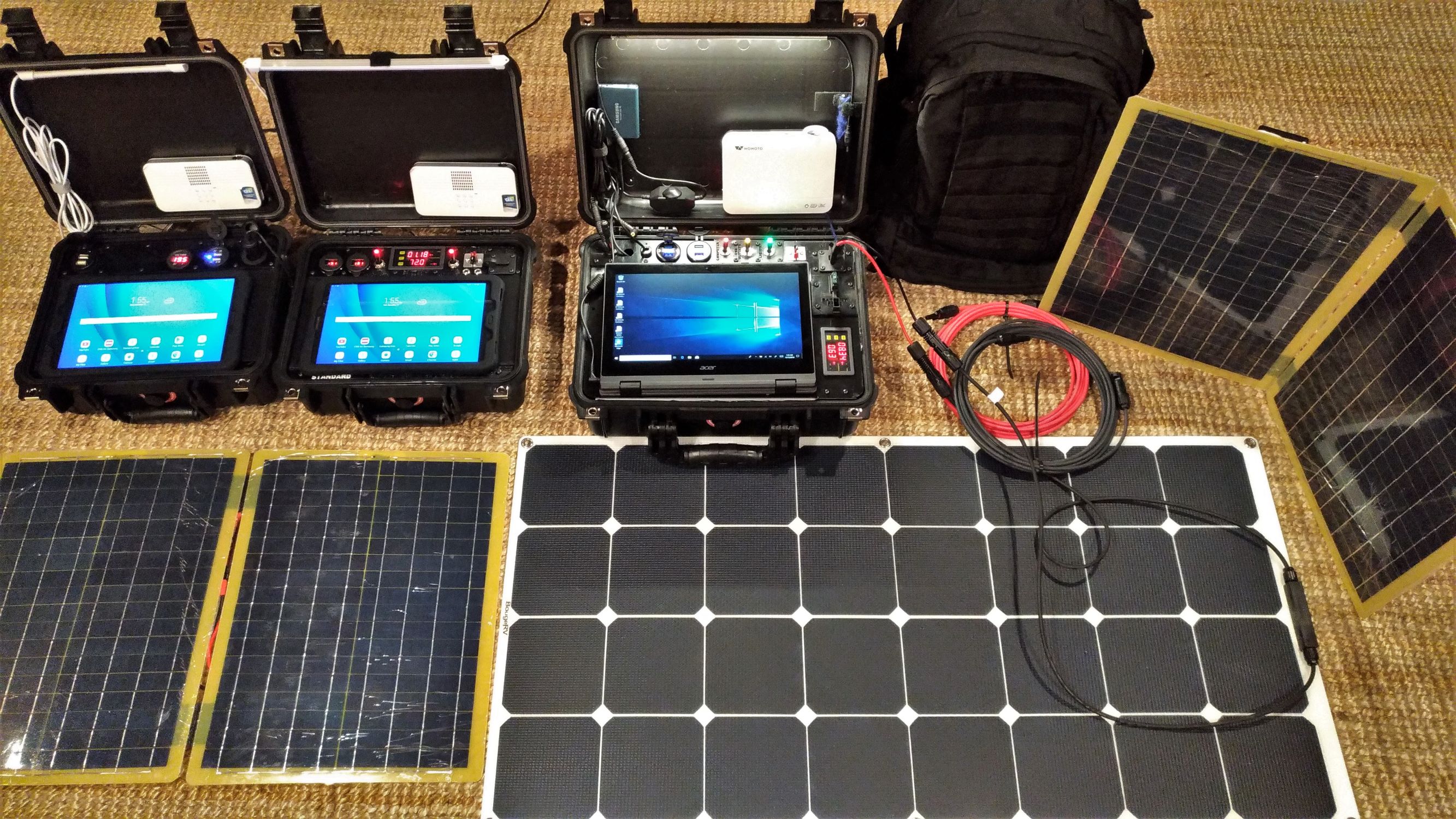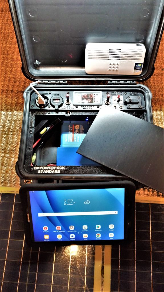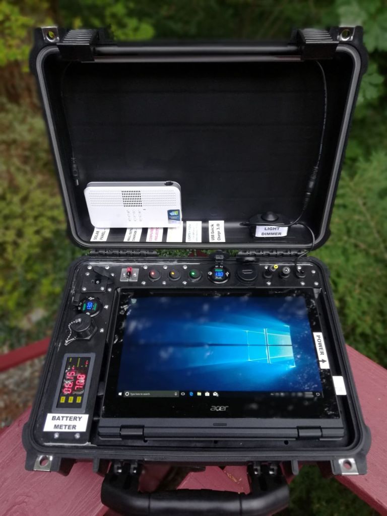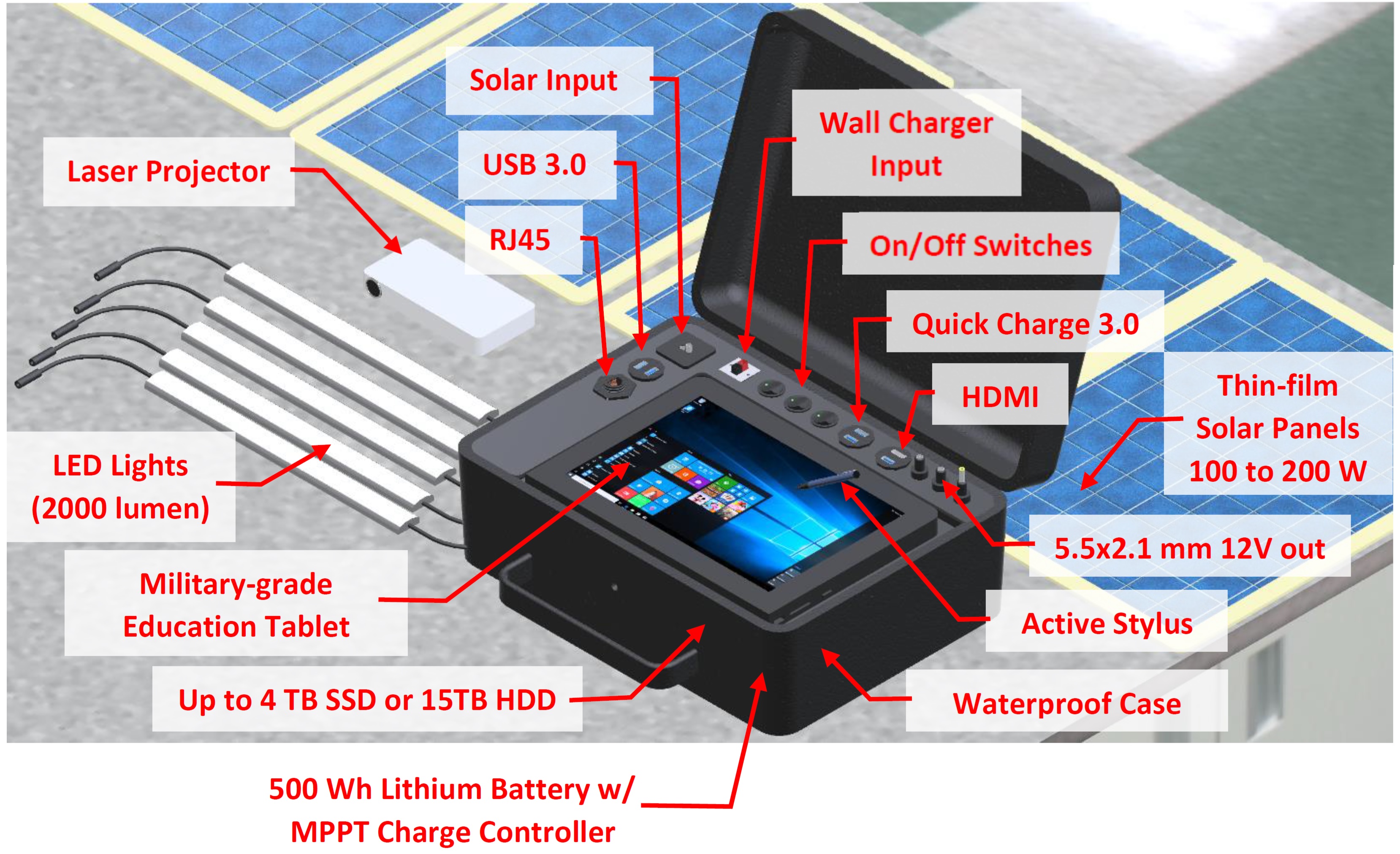 Each EmpowerSchool 12V developer kit contains a military grade windows laptop, 12V 40Ah lithium battery, 100-200W solar panel, and classroom projector